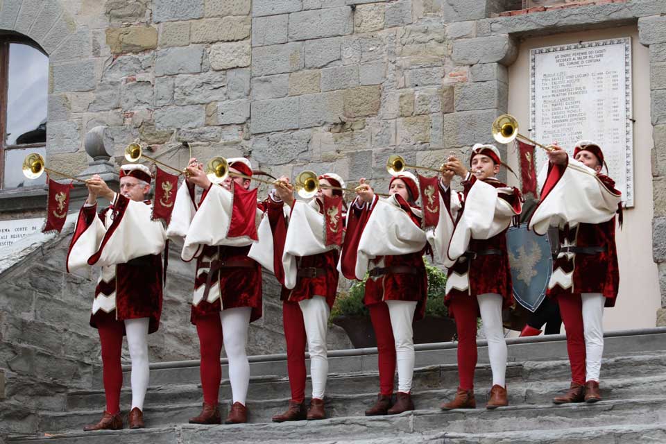 The trumpet players belong to the Gruppo Musici della città di Cortona (Group of Musicians of Cortona). Together with drummers, they accompany the parade during the different performances. The players in particular stand out for their beautiful choreography during their performances, when they create many different figures on the move, and for their musical skill and huge repertoire evoking intense emotions in the audience.