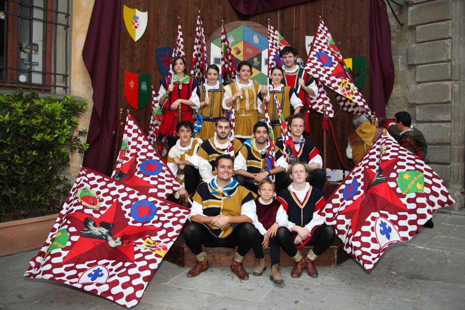 The Flagflyers Association represents the flagship of the Historical Group of Cortona. Its aim is to teach young people the old art of flag-flying, which is the symbol of good values like loyalty, fairness, brotherhood, love, honour and team spirit. The Flagflyers Association stands out thanks to high-level exercises from the technical and athletic points of view, both by using small flags and flags measuring 4 m in length, which are really impressive and choreographic.