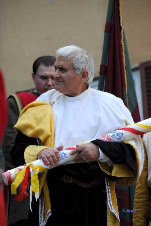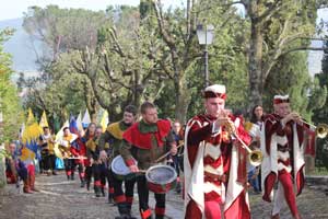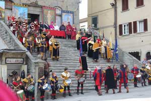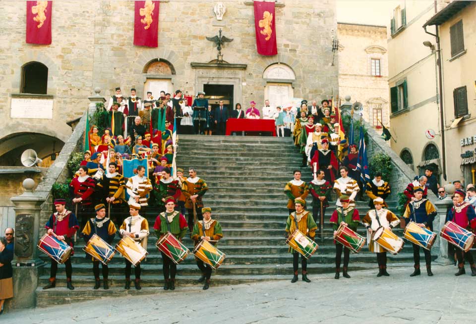 Dodici armeggiatori, designati dal vicario, giostravano con armi e bandiere somministrate dal Comune e finita la festa venivano donate alla Chiesa “sull'ora di vespro il vicario con gli ufficiali foresi, i consiglieri del Comune, i rettori ed i consiglieri delle arti, il clero ed i frati, dalla Piazza del Comune, si recavano processionalmente s Santa Margherita per offrire due ceri ciascuno di 4 libbre…” (dal cap. XX pagg. 48 e 49 de “Lo Statuto di Cortona dell'anno 1325” Bibl. Com.le di Cortona. Ed. 1963 Mancini, “Cortona nel Medio Evo” Firenze, 1894).
